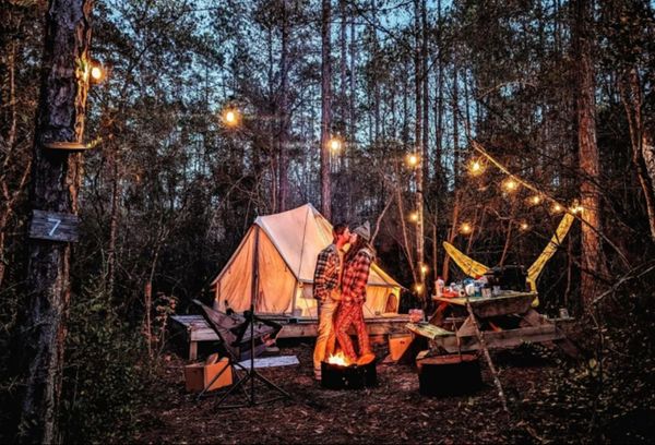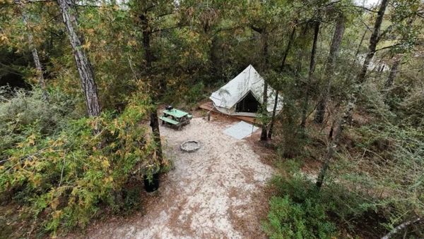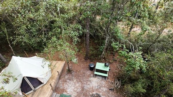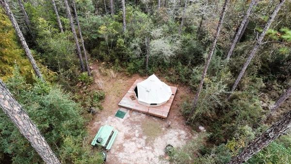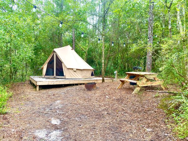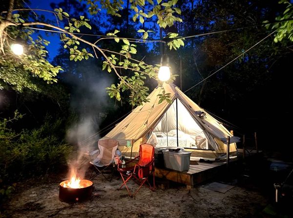 Each yurt-style tent is adorned with solar string lights, and outdoor essentials like a picnic table, fire pit ring, small charcoal grill, and trash can are provided.